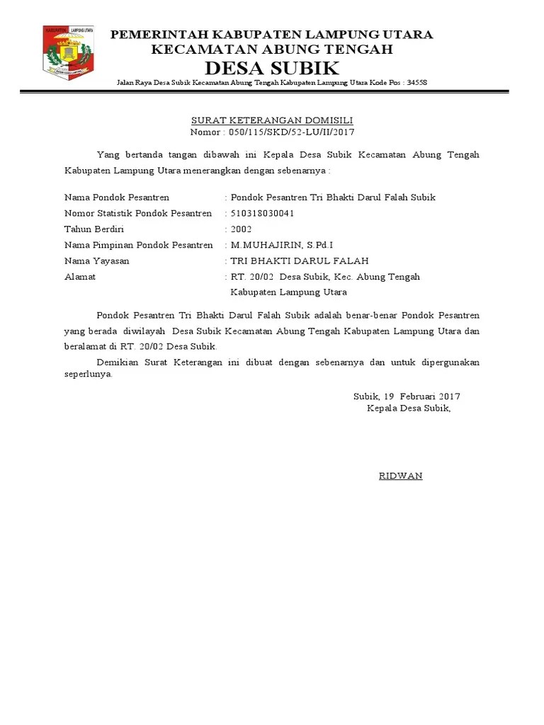 Cigandik rt.015/04 desa angsana kec. Surat keterangan domisili dari desa/kelurahan. Desa cinerang keterangan domisili ponpes al istiqomah. Foto copy bukti kepemilikan tanah milik atau wakaf yang sah atas nama yayasan/ponpes/madin/tpq. Surat keterangan domisili pondok pesantren madrasah diniyah .